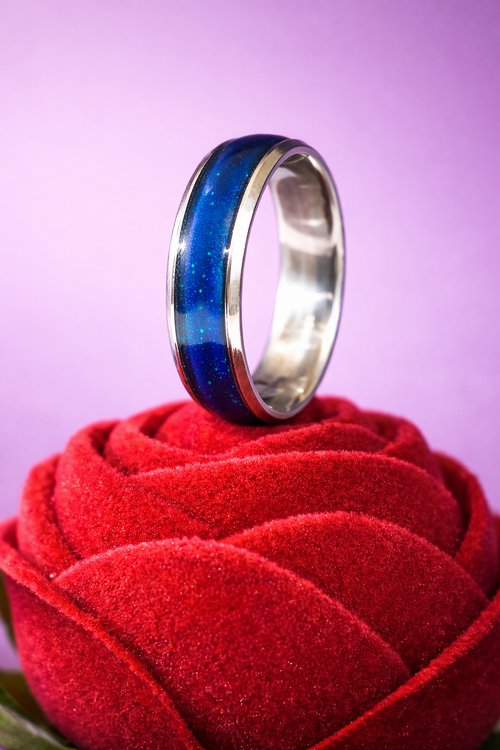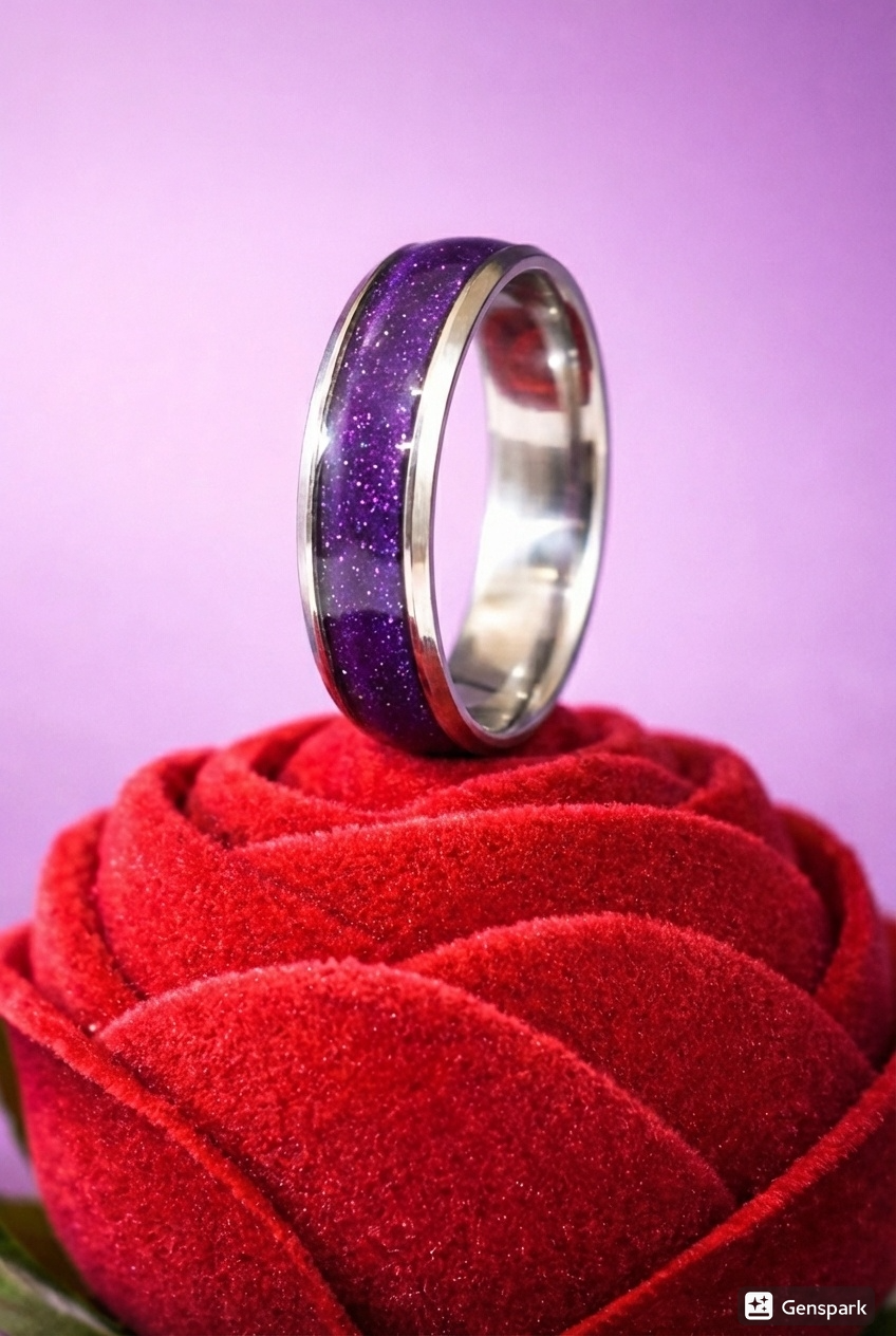 این انگشتر با استفاده از ترکیب خاص رزینهای حساس به دما و نور، در شرایط مختلف طیف رنگی متفاوتی از خود نمایش میدهد؛ گاهی بنفش عمیق و آرام، گاهی نزدیک به آبی تیره و اسرارآمیز.